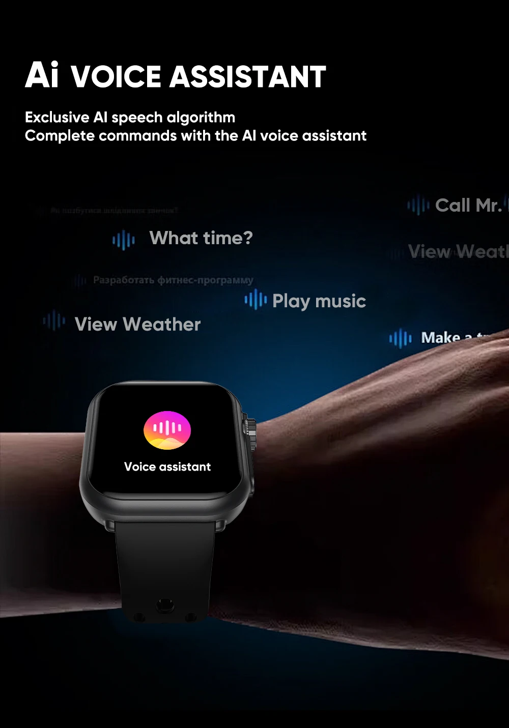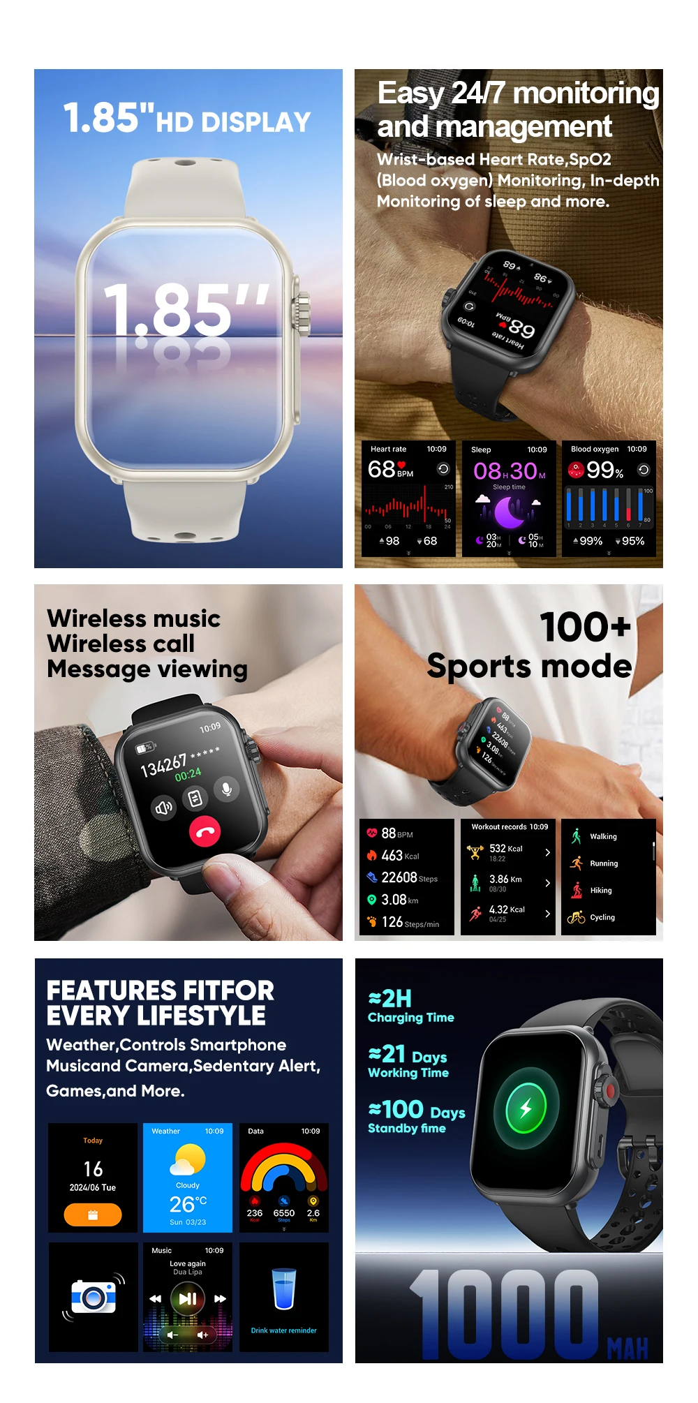 7.Our Smartwatch is more than just a fitness tracker. Stay connected with your world with our messaging and notification features. Receive calls, texts, and social media notifications directly on your wrist. Our Smartwatch also includes a music player and voice control, so you can easily manage your entertainment on-the-go.