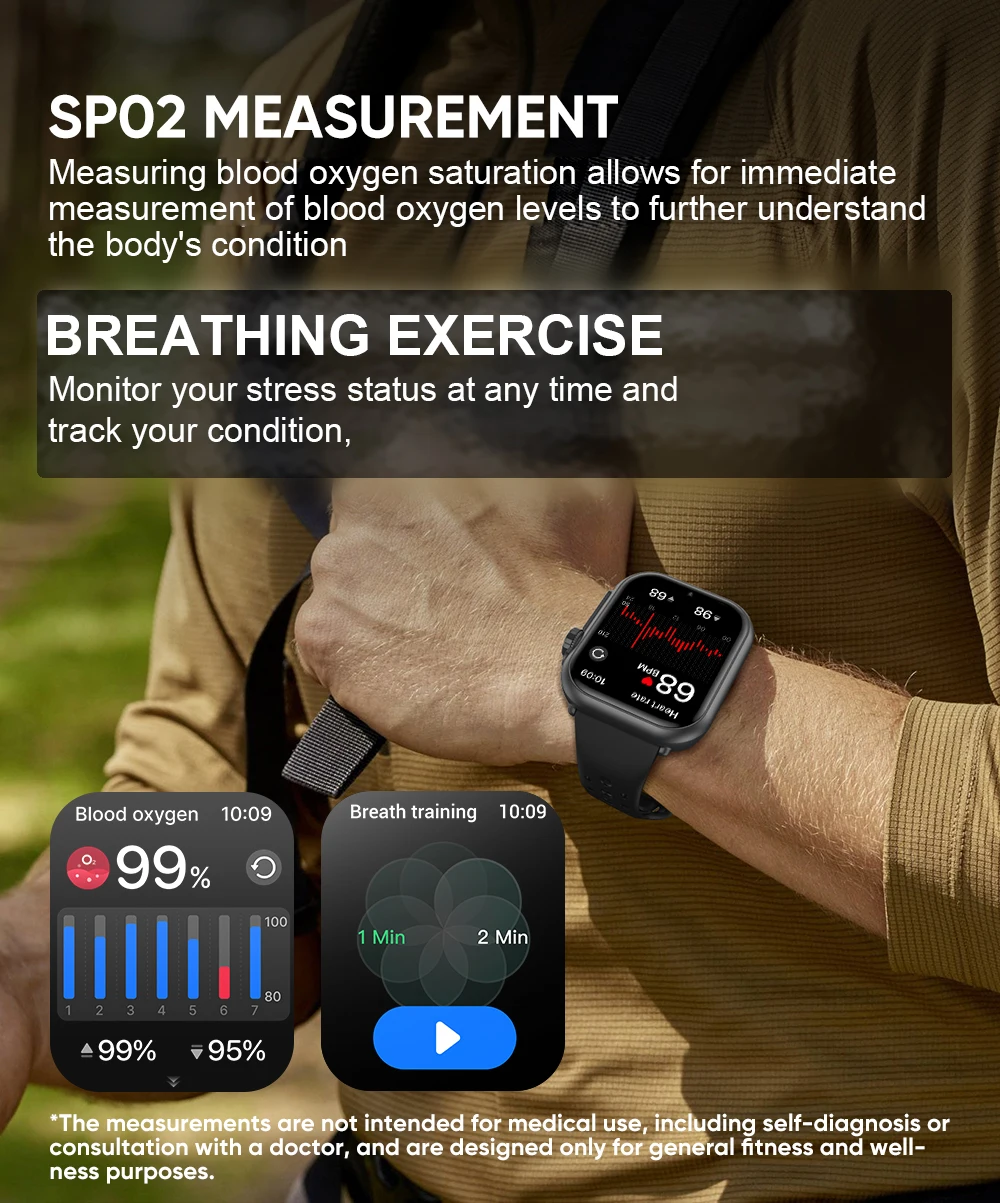 ➤Basic Function: Heart rate monitoring, sleep monitoring, step counting monitoring, calorie monitoring, blood oxygen monitoring, Bluetooth calling, Call answering/rejecting, one click connection prompt, breathing training, breathing rate, sleep detection, multiple themed styles, calculator, voice assistant, password lock, Bluetooth music playback, music control, clock, date display, multi dial, OTA upgrade